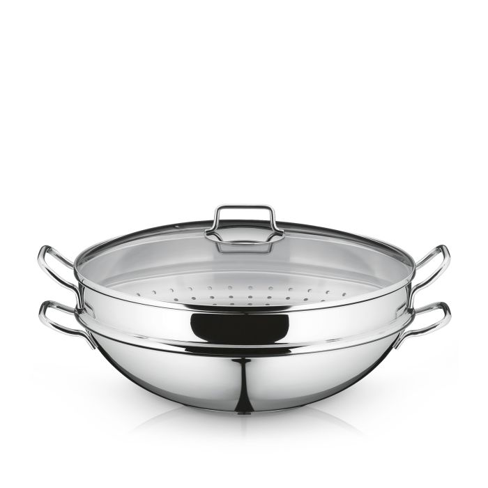 WMF Macao wok set, 36 cm, TransTherm univerzalno dno, Cromargan® nehrđajući čelik, Siguran za uporabu u pećnici, Periv u perilici posuđa, Wok za indukciju, „Sve-u-jednom“ paket, Stakleni poklopac, Rešetka za tempuru, Košara za kuhanje na pari, Knjiga s receptima, 07.9256.6040